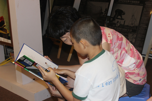 臺(tái)下正在讀書的母子